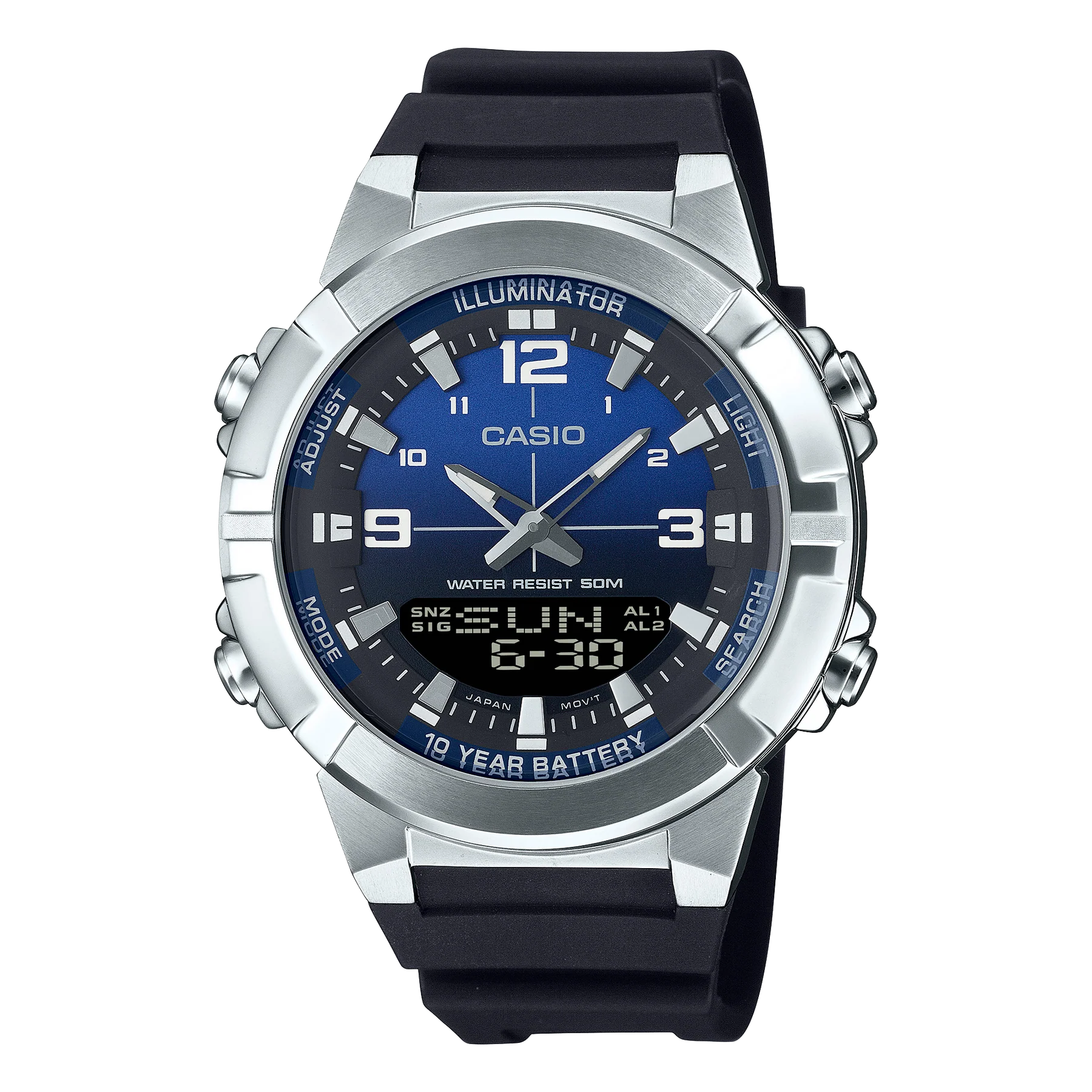 Digital: Hour, minute, second, am/pm, month, date, day