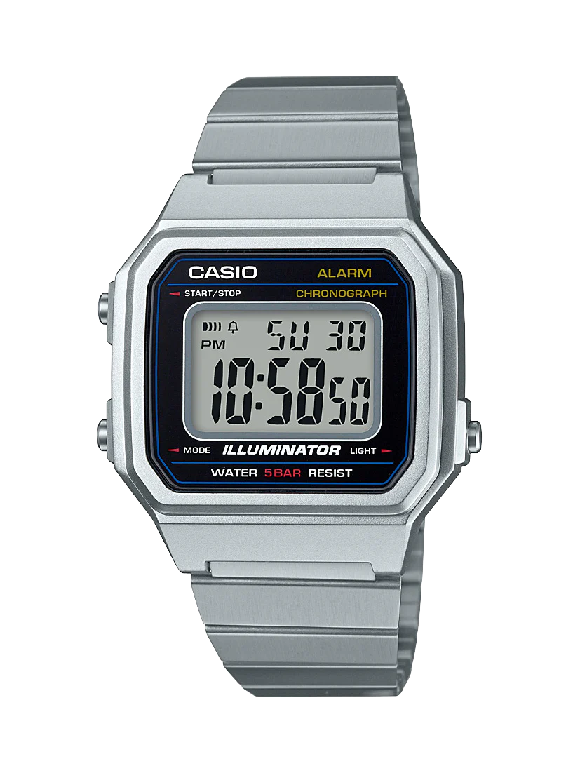Large time digitsLED backlight50-meter water resistance1/100-second stopwatchDaily alarmStainless steel band